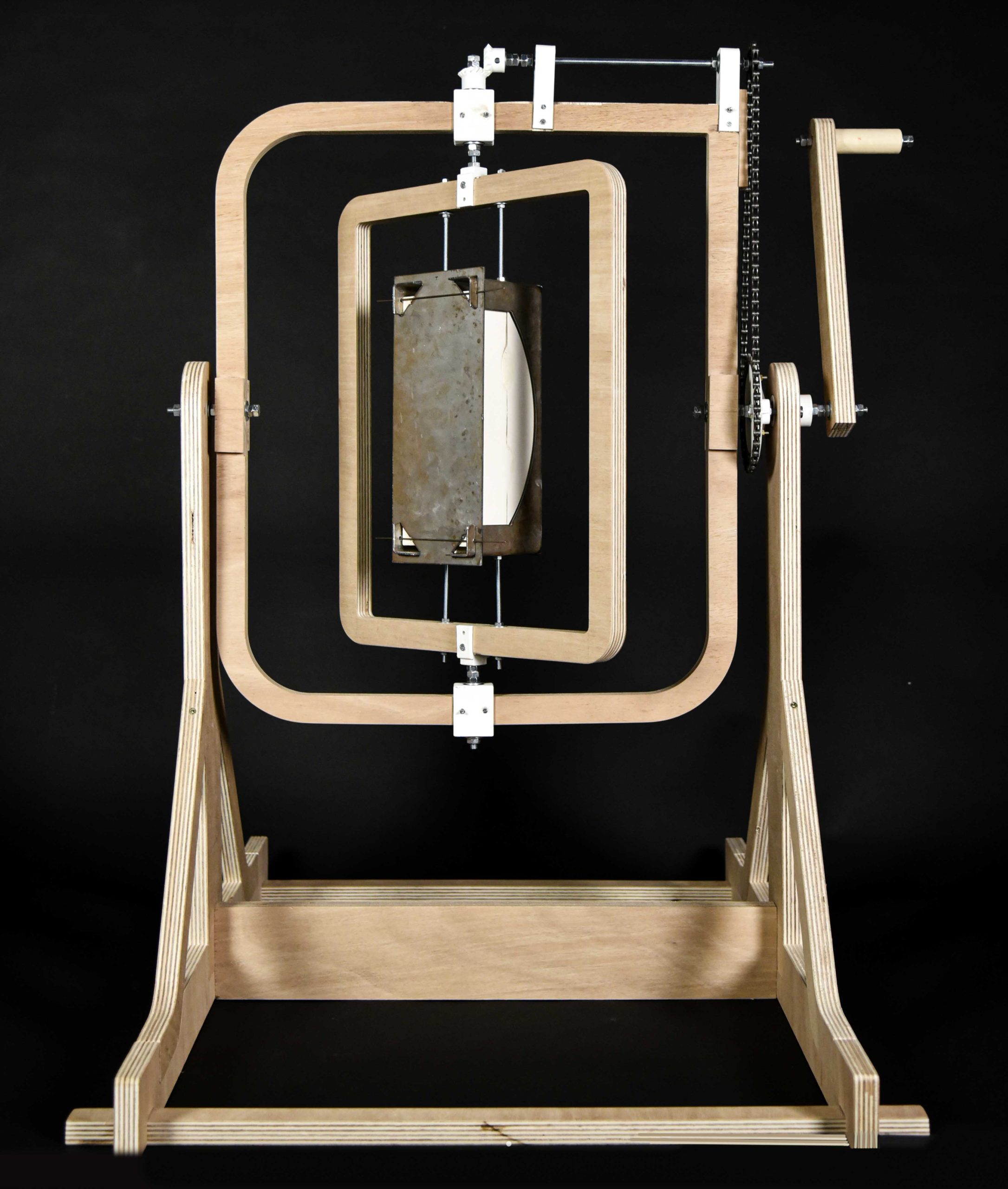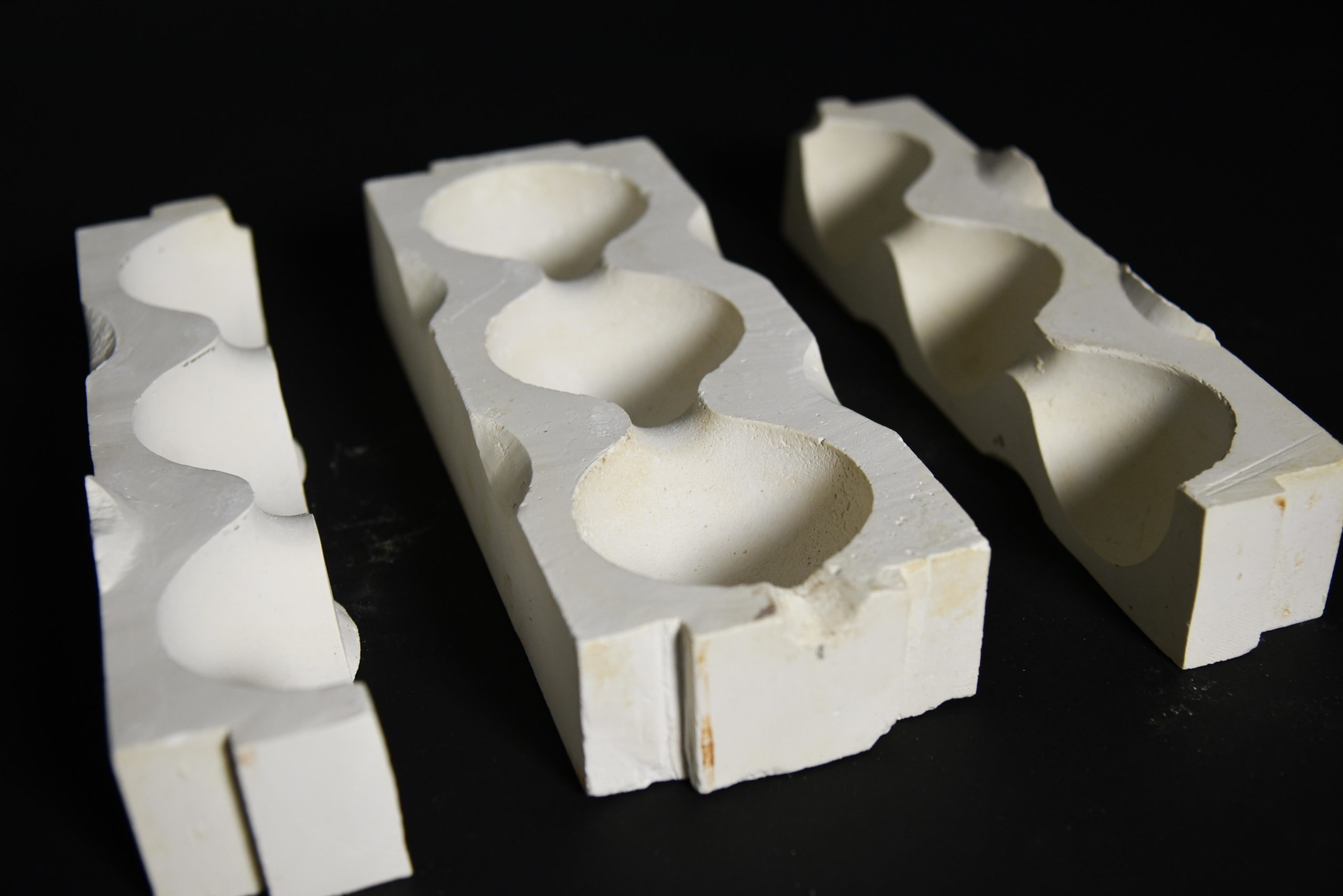 En parallèle, ils ont repensé le dessein du moule à clé en plâtre pour qu’il puisse s’adapter à la machine à rotomoulage. Pour être fonctionnel et résistant, un moule en plâtre destiné aux tirages multiples de cire de synthèse doit faire une certaine épaisseur et doit être entièrement imbibé d’eau avant chaque utilisation ce qui a une forte incidence sur le poids du moule. Néanmoins, pour un usage prolongé de la machine à rotomoulage, il est préférable d’y incorporer un moule en plâtre le plus léger possible. C’est à la croisée de ces contraintes qu’ils ont pensé le nouveau moule à clé, en réduisant autant que possible son épaisseur, mais en gardant suffisamment de matière pour qu’il puisse faire son travail d’absorption sans se casser sous la pression.