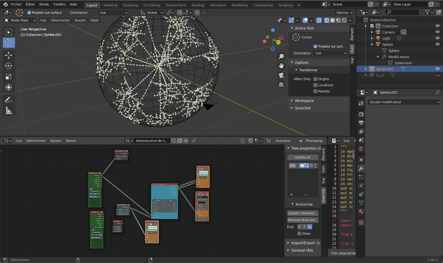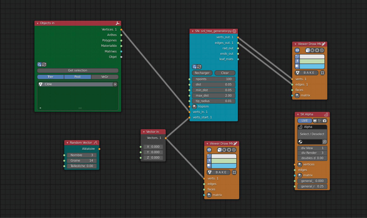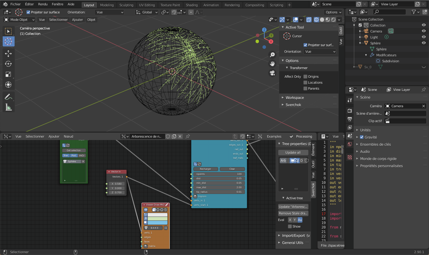 Après avoir expérimenté avec Processing, nous avons préféré nous tourner vers le logiciel de modélisation open source Blender. Ce logiciel nous permet de créer directement des fichiers imprimables en 3D, tout en étant un outil adapté au design génératif. Nous avons donc téléchargé des add-ons, du code python, et suivi divers tuto afin de créer un algorithme correspondant à nos besoins, toujours basé sur les motifs de Lichtenberg.