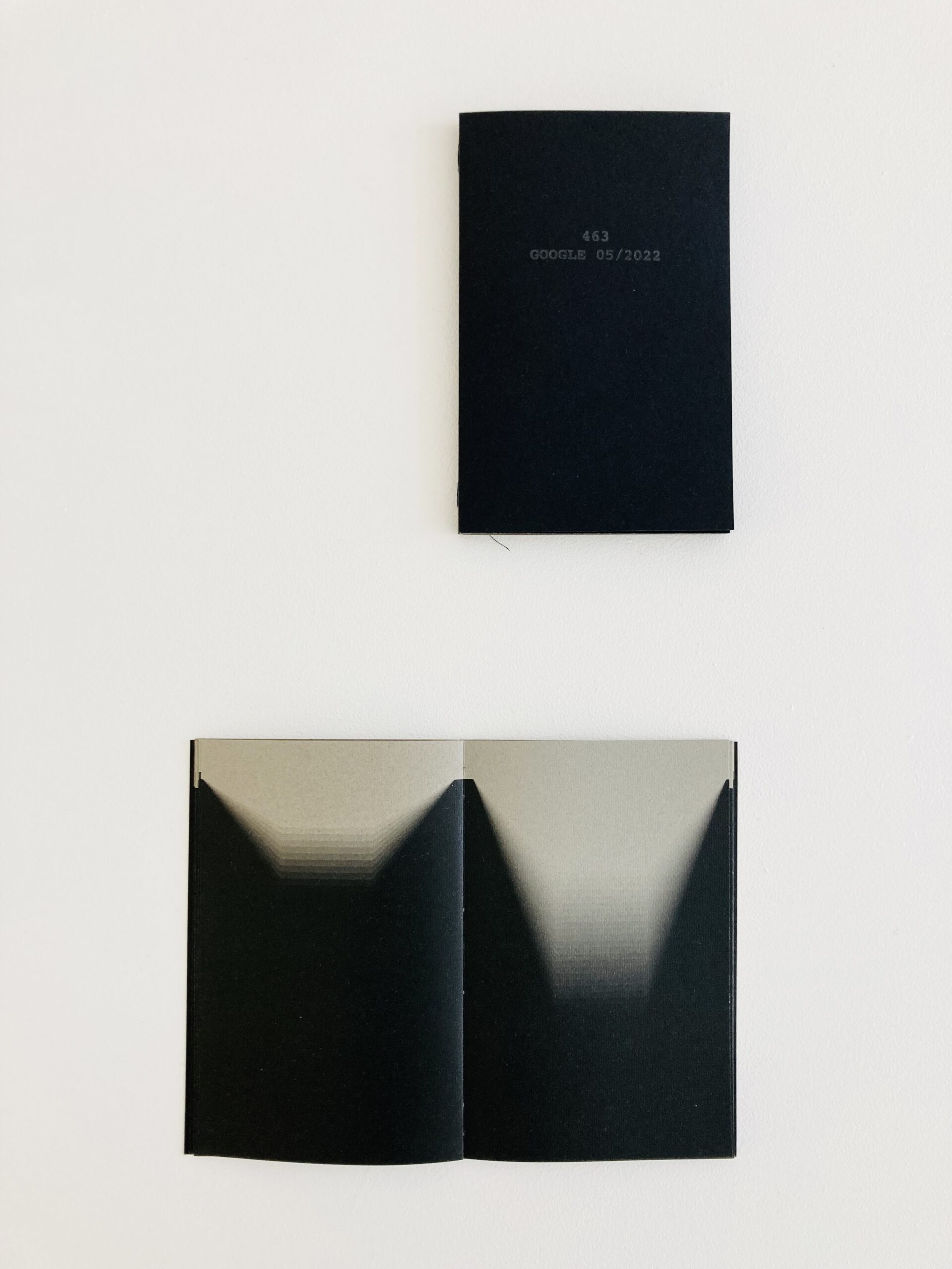 Dédale est un projet de recherche qui propose de visualiser les gouffres numériques que nous creusons chaque fois que nous repassons sur la même page web. Une première série est réalisée à l’encre de Chine avec la technique traditionnelle du lavis grâce à un protocole où la main obéit à algorithme définissant les coordonnées à suivre. Si dans un même jour sont comptabilisés 31 passages sur la page Google.com, sont donc superposées 31 couches, ou 31 strates d’encre pour creuser le profil. La deuxième série est, elle, directement dessinée par un algorithme. Selon le même principe, elle propose une visualisation du nombre de passages sur la page Google.com chaque jour. Les visuels sont alors réunis dans une édition par mois. Au total, le mois de mai 2022 réuni 463 passages sur la page Google.