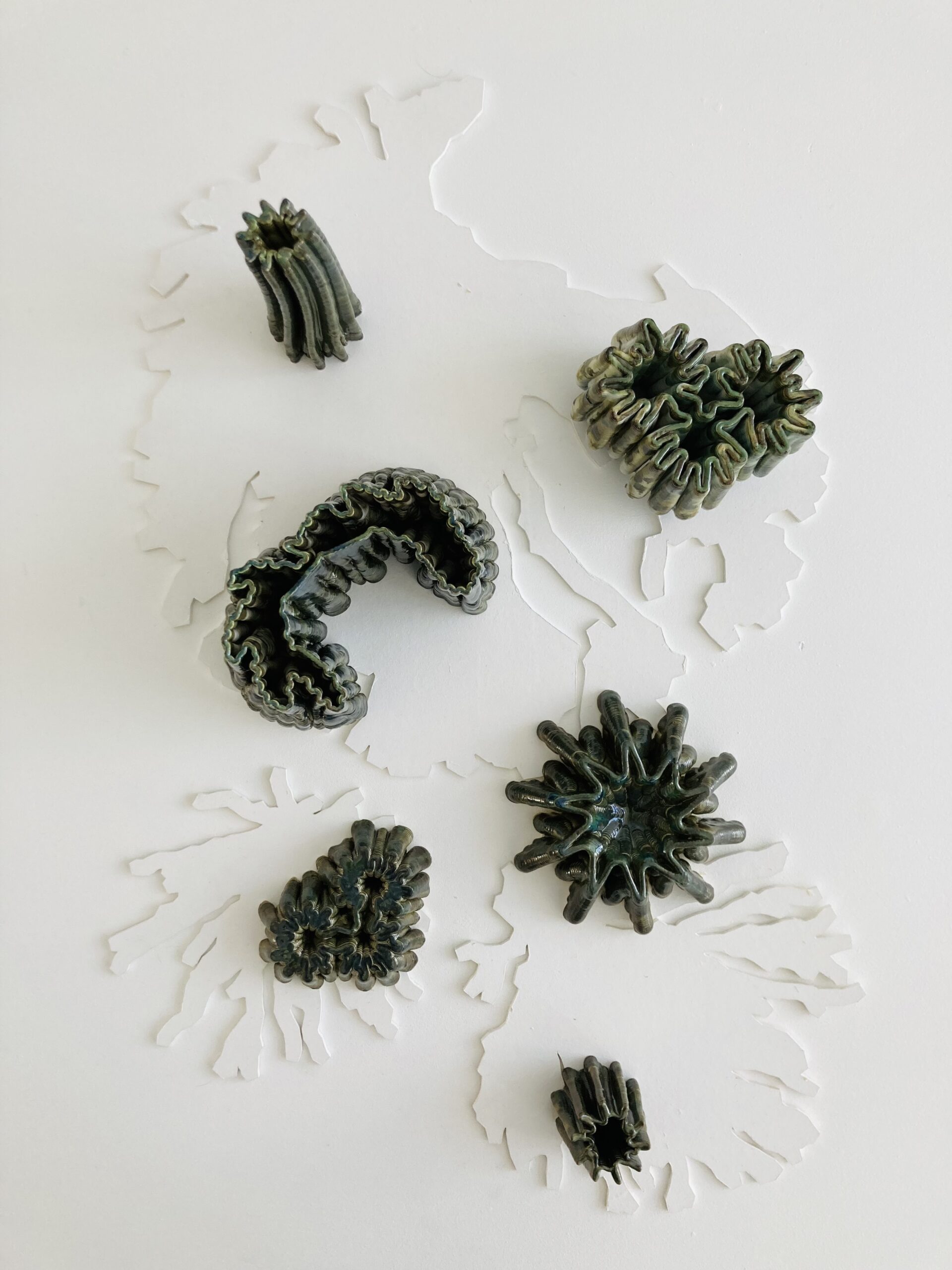 Le processus de création des sculptures se déploie à partir des pratiques manuelles du dessin, de la porcelaine et de l’émaillage, associées au codage 3D sur Rhino-Grasshopper. Chaque étape de conception constitue une opération de traduction au sein de laquelle s’exprime, dans le même temps, une nouvelle intention formelle. Le code pour l’impression céramique est directement issu de Rhino-Grasshopper, permettant une interopérabilité des procédés de la conception à la fabrication.