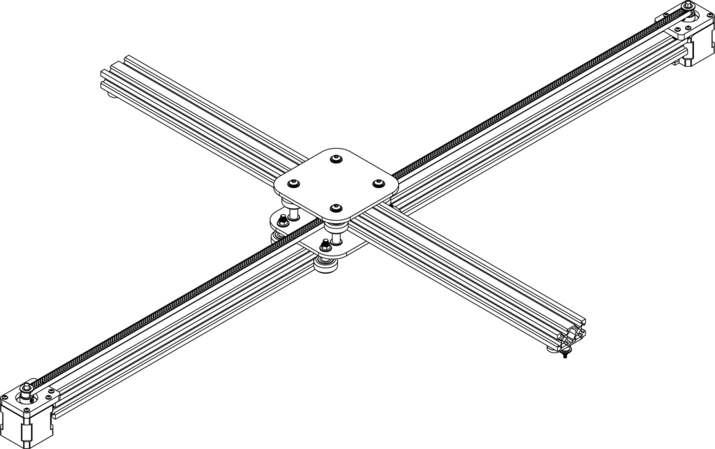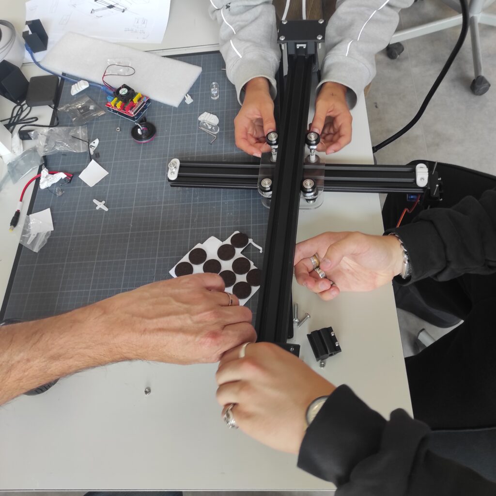 Lors du workshop de recherche 2024, les étudiant·es du programme ont été invité·es, à partir de cette première version, à concevoir, adapter et améliorer leurs propres machines à deux axes. L’objectif était de les engager dans un rapport direct aux outils : en comprendre le fonctionnement, les contraintes matérielles et les logiques de conception qui les structurent.