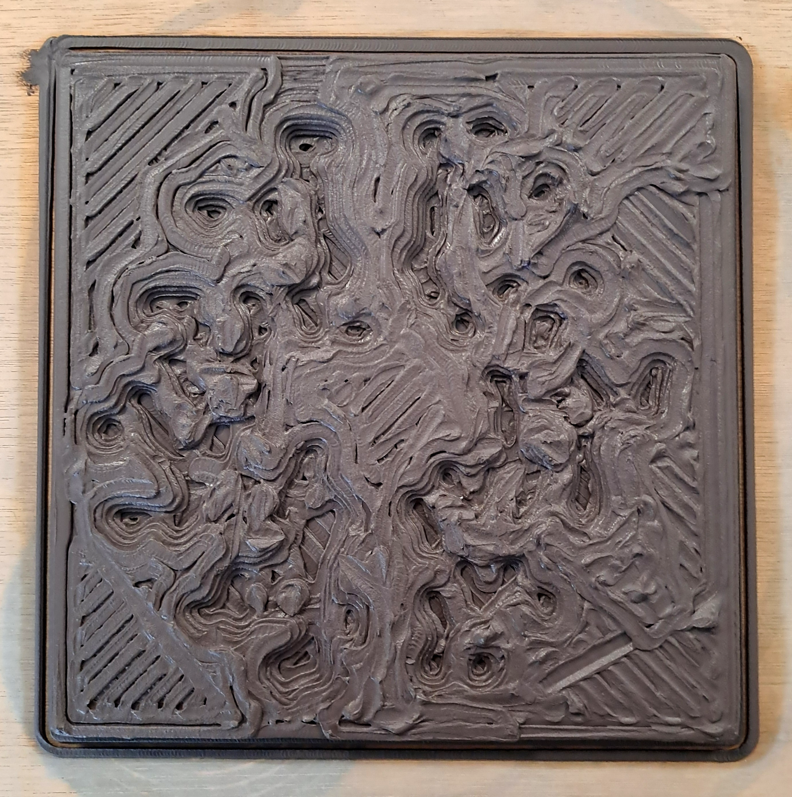 Au cours de ce processus, nous avons constaté que le changement de hauteur de la buse permettait d’obtenir des résultats plus précis dans la reproduction des motifs. En ajustant cette hauteur, nous avons continué l’expérimentation pour optimiser la qualité du rendu final. Nous avons exploité la manière dont le plotter interprète le dessin que nous lui avons donné à exécuter. Mais ce qui nous intéressait, c’était surtout d’observer le résultat inattendu dû à l’inexactitude de la machine à reproduire les motifs. Un phénomène principalement induit par les limites et contraintes techniques de cette dernière. Au lieu de voir la forme produite comme imparfaite nous voulons la considérer comme une opportunité de pouvoir faire évoluer le motif. Ce processus témoigne de l’empreinte des outils numériques, des machines sur la création numérique.